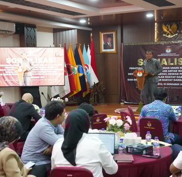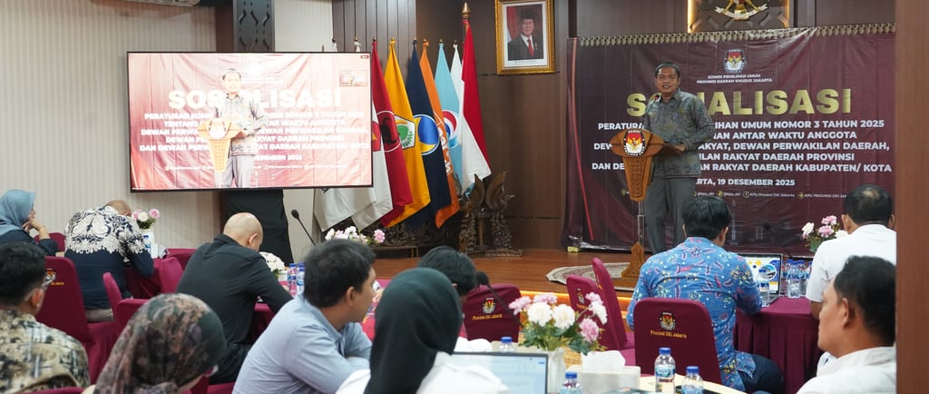 Jakarta - Komisi Pemilihan Umum (KPU) Provinsi Daerah Khusus Jakarta menggelar Sosialisasi Peraturan KPU (PKPU) Nomor 3 Tahun 2025 tentang Penggantian Antar Waktu (PAW) Anggota DPR, DPD, DPRD Provinsi dan DPRD Kabupaten/Kota serta Pemutakhiran Data Partai Politik Berkelanjutan Semester II Tahun 2025, pada Jumat (19/12).